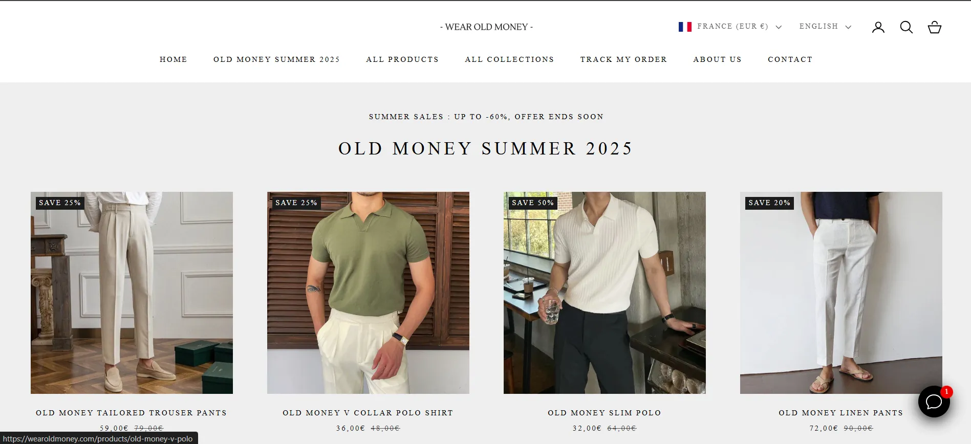 Expérience produit optimisée : fiches produits détaillées, visuels de qualité, prix promotionnels bien visibles, description du style Old Money, mise en avant des matériaux nobles (lin, laine, suède…).